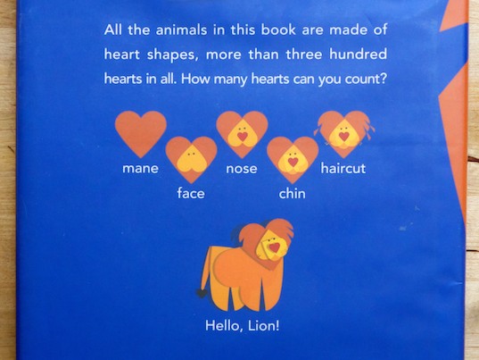 I was pleasantly surprised by this zoo-tastic book. It is fun to read aloud as well as study the animals and try to decipher how many hearts make up each. I can imagine the projects to be made by cutting out a bunch of different hearts and attempting to recreate the animals and make up new ones as well. The back cover even includes a breakdown of the lion face!