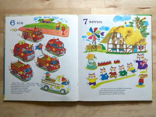 And on he goes one through ten, grabbing some friends along the way. The counting is not without adventure either. The crew is interrupted at six by firefighters flying by to the Cat family’s house where seven cats are fleeing the flames.