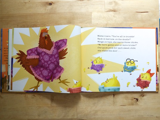 It won’t be the last unfortunately, but as the book progresses, Mama’s tactics are a surprise for everyone and bring a smile on and off the page. I certainly will not give the rest away, but let’s just say that those apples don’t fall far from the tree. If anyone knows how to really be wild, it would be a big Mama of five rambunctious chicks.