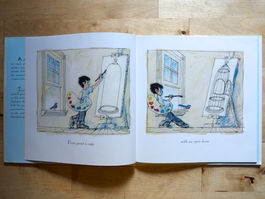 Prévert’s words describe beginning by painting a cage with an open door, adding some inviting elements, carrying the canvas to an outside location, and then waiting….