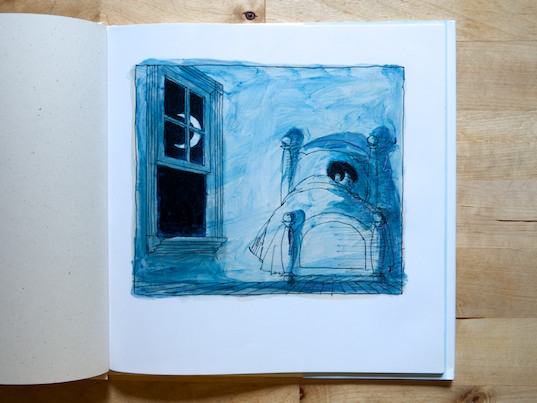 Gerstein actually begins the illustrations several pages before the title page appears, an act I don’t often see. It is a lovely set up. A boy asleep is awakened by a bird appearing on a sill. And then the lesson, and the text, begins.