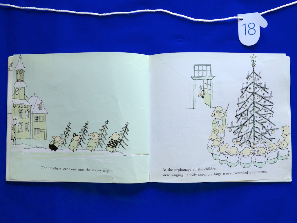 One stop after another brings more disappointment as trees seem to be everywhere. Finally, as they start to toss the trees away, they are met with a poor pig girl who shows them a depressing house with four Christmas-less apartments. The pig boys jump into holiday cheer wholeheartedly and fill the place with decor as well as necessities and extra items to brighten the lives there. It is a joyous occasion and they return home, not only pleased with themselves, but to find gifts* from their parents including “a marzipan sausage for the dog.” That always cracks me up!