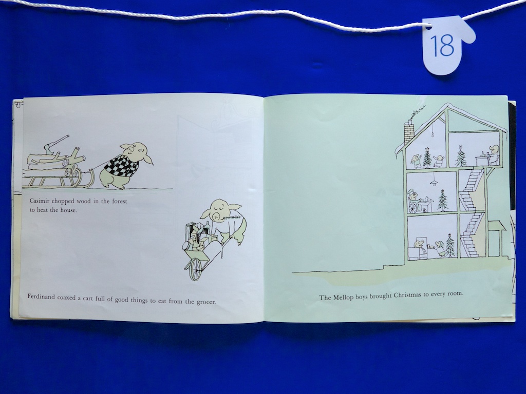 On this eighth day of December, I bring a pathetic paperback copy of a darling little book. You must meet the Mellop family! This is the Christmas edition from a delightful series of books about a family of pigs with fantastic names, adventurous spirits, and generous hearts. Come have Christmas Eve at the Mellops’ by Tomi Ungerer, 1960.