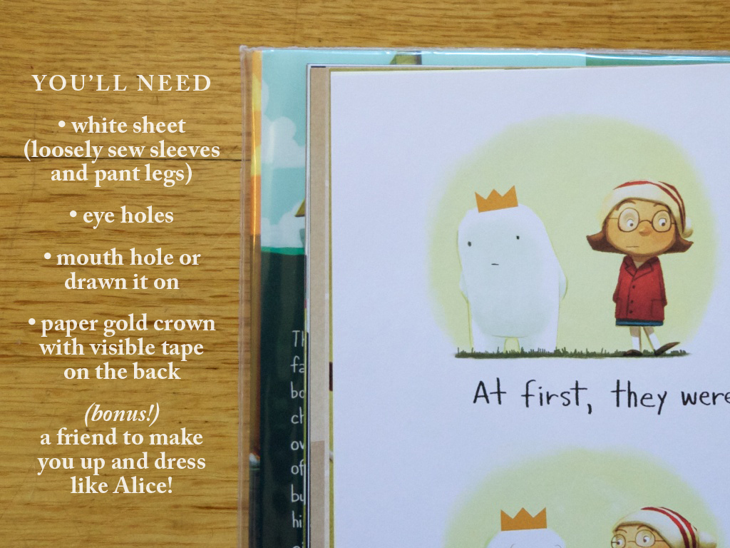 This might possibly be my favorite costume idea for picture books this year. I love that it is kind of a unique twist on a ghost-like character and oh, he just looks so lovable. Dan Santat’s illustrations actually show Beekle’s crown as being paper and taped on one spread, so the whole thing just seems ripe for recreating. Pair it with an Alice character costume from Part 1 and it is picture book perfection!