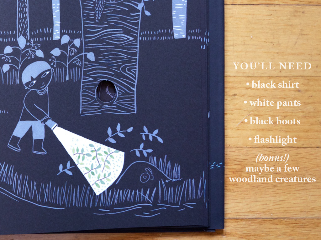 Hopefully I’m not making a terrible mistake by assuming this is a boy in Lizi Boyd’s new book, but I’m sure the costume could be adapted either way! This is actually a new wordless picture book just out from Chronicle Books and it is striking to behold with its die-cuts and black pages with white accents. Given how quickly the sun sets now, I think it could be a marvelously fun and easy costume! And seriously, what kid doesn’t love to play with a flashlight?