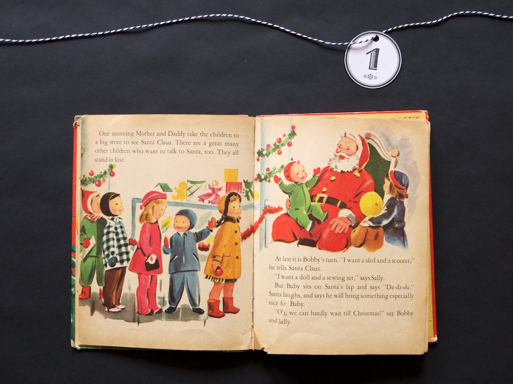 I did look up both author and illustrator, but unfortunately being a book from the 50s, it yielded little results. Marcia Martin appears to be a popular children’s book author whose real name was Marcia Levin. Her style here is narrative and simple without much pomp. The illustrator, Alison Cummings, does seem to have a few books to her illustration portfolio, all of which seem to include these peachy-skinned, blonde kiddos. I do love the strong, vibrant color of these pages that have lasted over 60 years! That Santa suit still looks so deliciously red. And the outfits, while I know they are mostly representative of the fashion in that time, I just love them! I’m so glad she sprinkled patterns throughout like on the living room armchair, the bedspreads, and even the kitchen wallpaper. Christmas is a perfect time to get nostalgic, even about eras you didn’t live in. Christmas is coming!