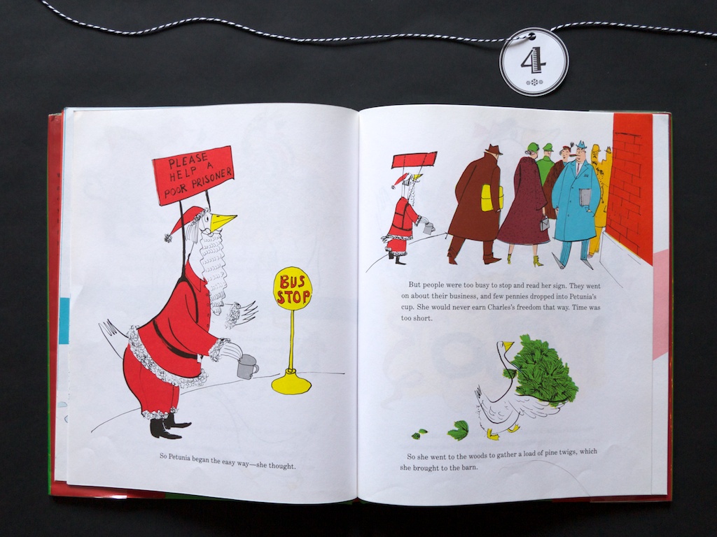 Squeaking in with day 4’s post in our 2014 Christmas book Advent, here is a classic book starring lovable old Petunia. Roger Duvoisin’s little goose heroine is always a treat to read and her Christmas tale is a hoot for sure. Check out Petunia’s Christmas by Roger Duvoisin, 1952.