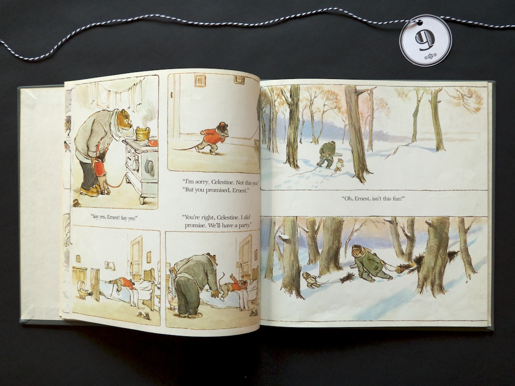 Ernest and Celestine are a duo originally published in French. This special Christmas story may seem abrupt to a reader who has not already made acquaintance with the two friends as the format of Ernest and Celestine stories consists purely of dialogue. There is no intro to them here, but instead a beautiful dance between reading the written dialogue and studying the stunning illustrations.