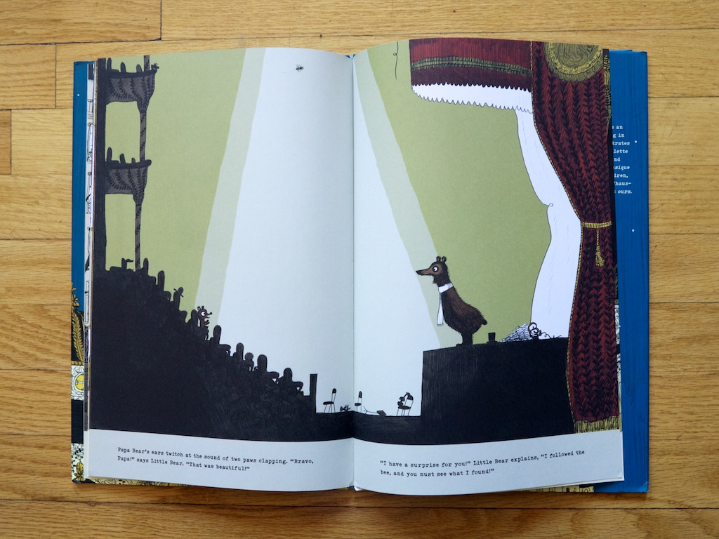 Every read I find something new. Throughout the book you are searching for the Papa, who is chasing the Little Bear, who in turn is following the bee. When the chase ends in a large opera house, the Papa mistakenly crashes the stage and decides to perform for the audience to calm their fears. His loving bear song has the complete opposite affect, clearing the house. All except for his little bear who cheers and announces he has found the bee’s secret stash. The two end their adventure in a father child cuddle ready to hibernate with honey-filled tummies.