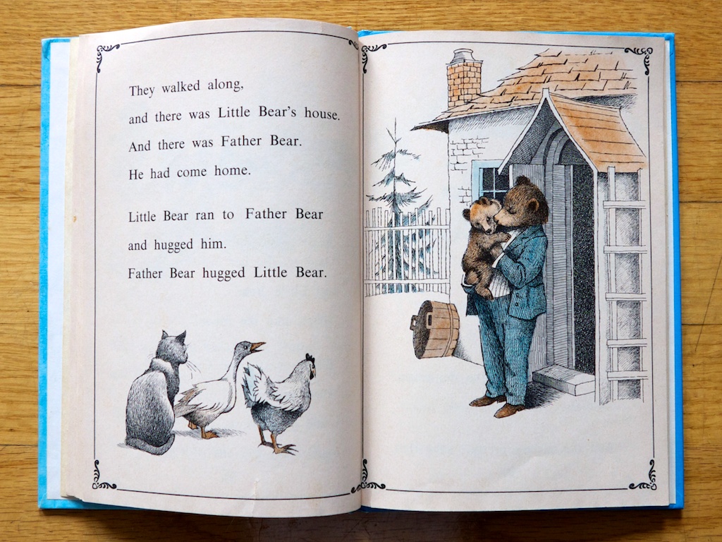 It sounds so simple, and yet the reality of working well and then leaving it behind physically and mentally is so incredibly difficult. Father Bear doesn’t show guilt about being gone to work, but he comes home to his family. I love the wording that Little Bear hugged Father Bear. And then Father Bear hugged Little Bear. Father Bear is completely there and returns the affection. Work is at work and he is at home.