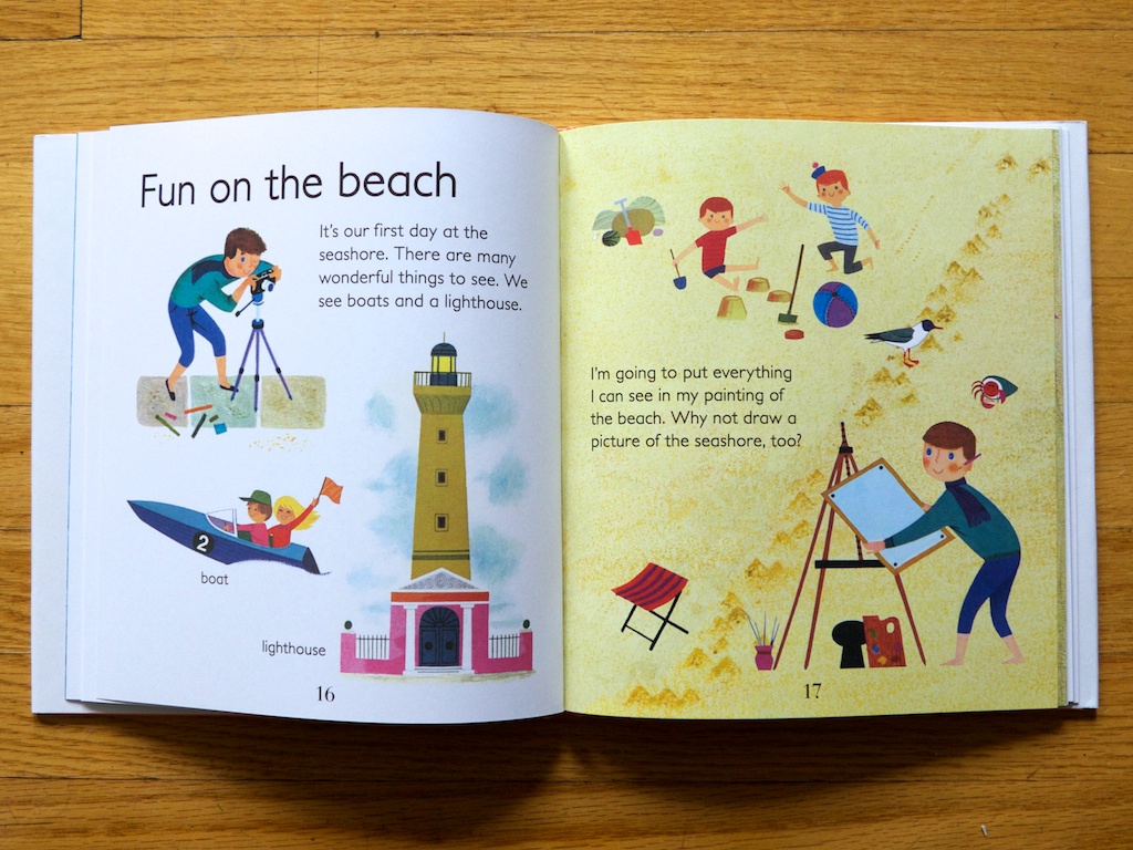 The books coming out from Grée’s work are a mixture of board book and long picture book, and are mostly informational, non-fiction, and word books. Seashore is a large, long picture book. It is packed full of information from what to pack for your beach trip, what kinds of things you’ll see in and out of the water, and interesting facts too. It is a commitment to read, but I also think these type of books are a great pathway between typically short, clever picture book stories and full-on, detail-oriented, non-fiction books. The information paired with such delightful illustrations make for a stellar combination.