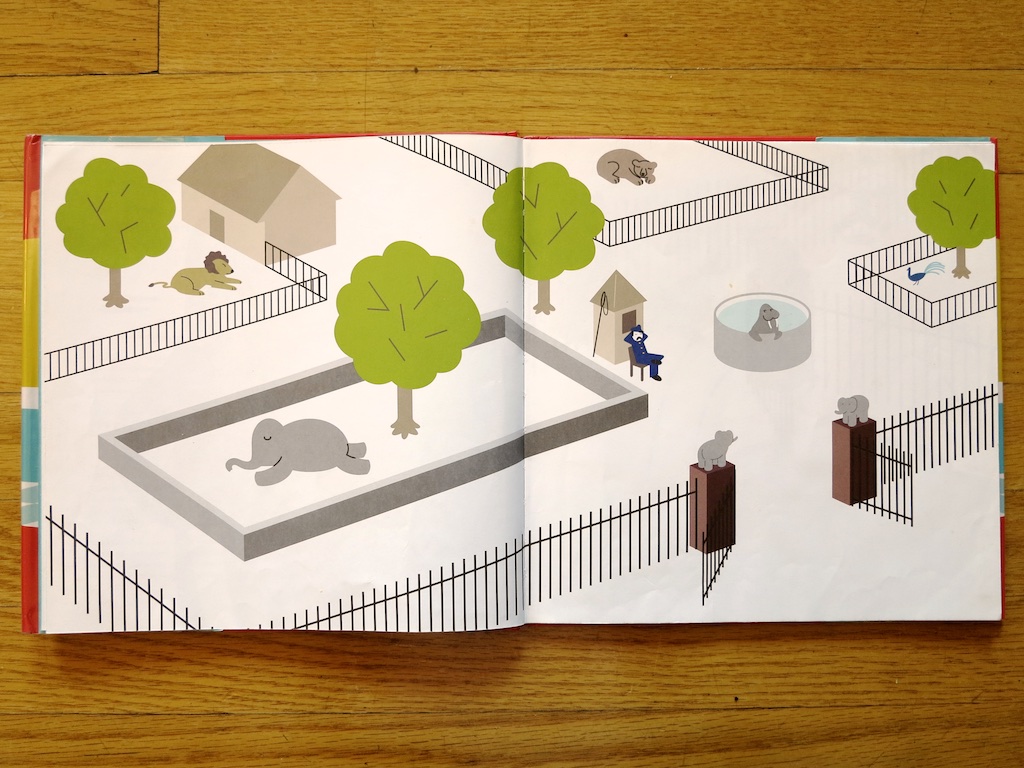 At the opening of the story, we are greeted by an image of Walrus staring at an open gate of the zoo. All the animals, and the keeper too, are lounging and dozing. But Walrus is alert, perhaps unsatisfied, curious, or just taking the opportunity that has presented itself.