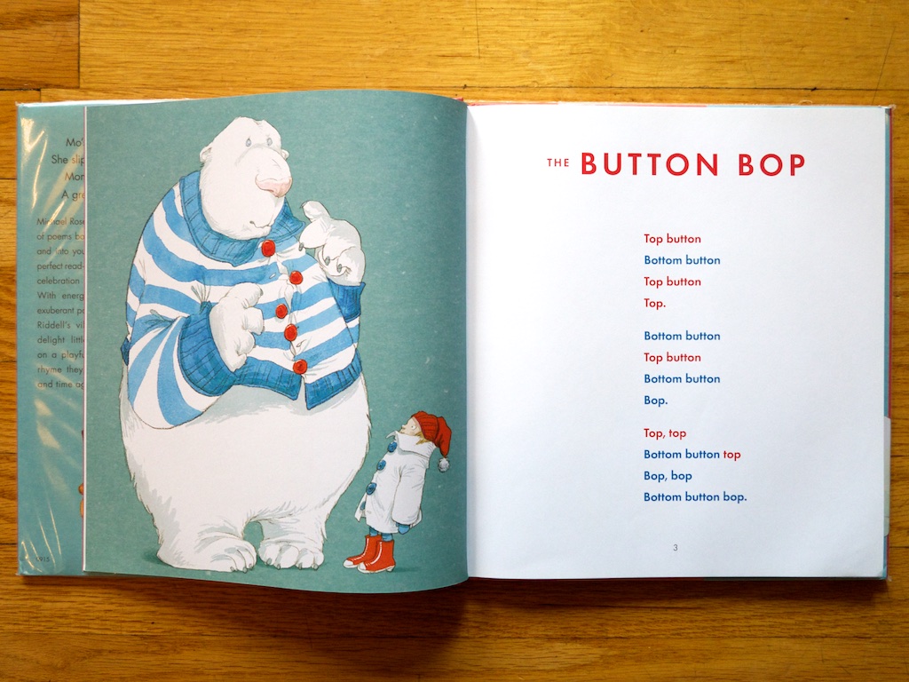 There are thirty-five poems in the book, almost each one claiming a spread of its own. The layout of the book is marvelous. It is an oversized book, similar to a picture book, with ample white space and saturated color on gorgeous uncoated paper. I did not find a designer’s name for the layout, but I love the mix of large, colorful typography with Riddell’s excellent illustrations.