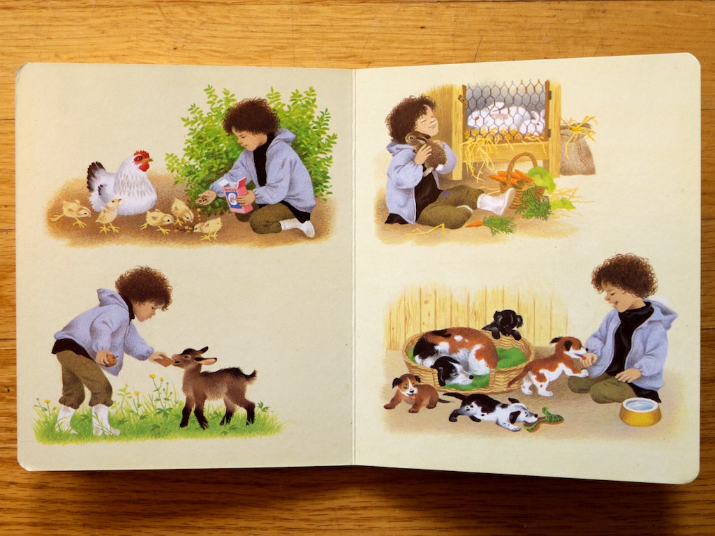 The main character of the book is a curly-headed little girl who can be seen doing all the quintessentially delightful things involving spring: planting, picking flowers, riding in the sunshine, feeding all the new baby animals, and even painting Easter eggs.