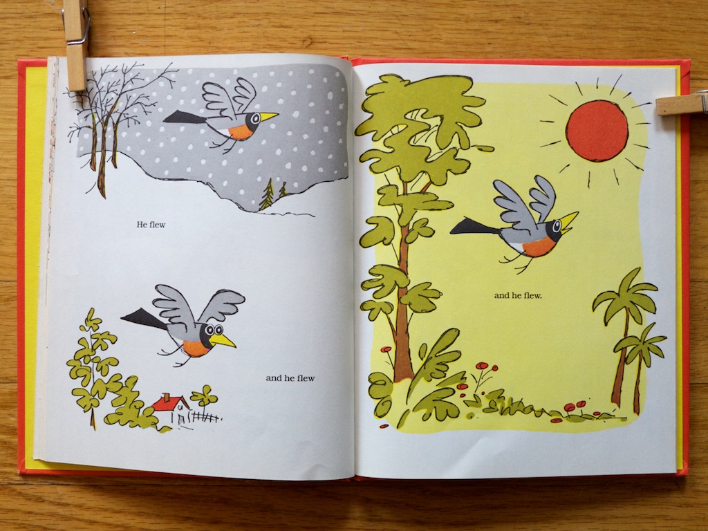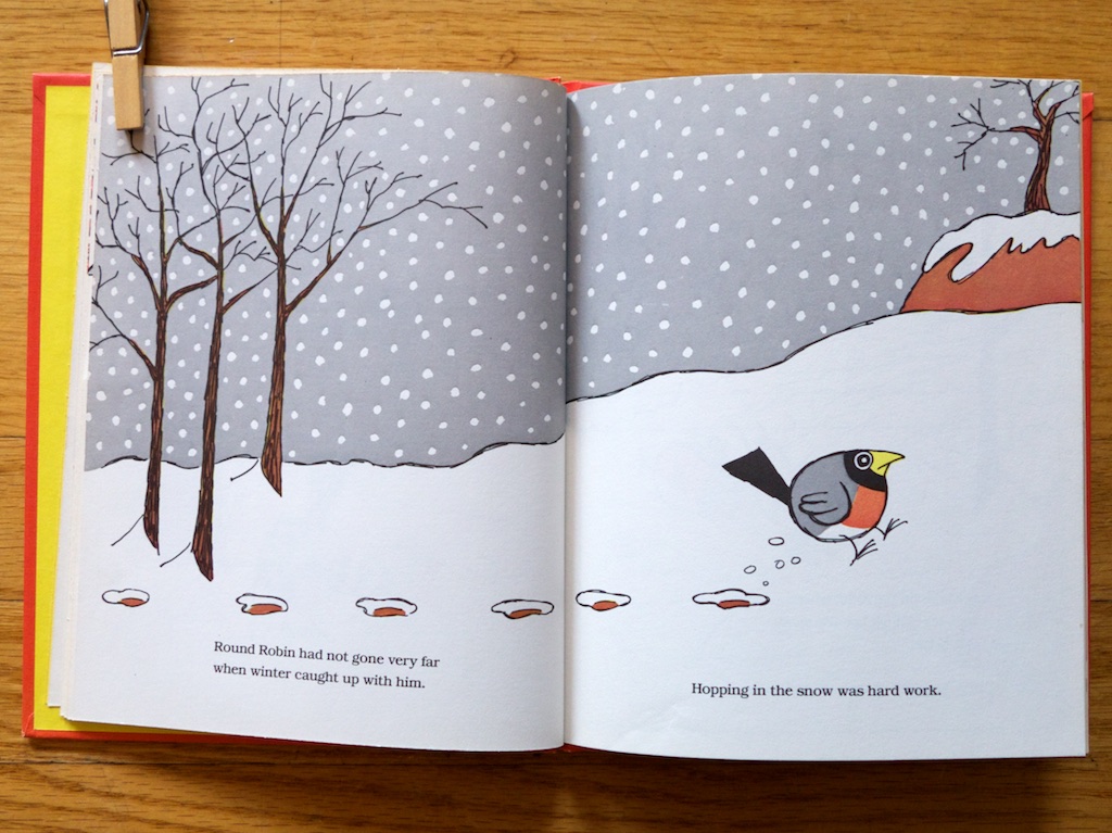 When he arrives and reunites with his flock, he is so hungry that he eats and eats and eats some more until he finally resembles his name once again. And as it turns out, his trek took all of winter, so just as he arrives and rests, the flock heads back home and Round Robin begins the journey all over again.