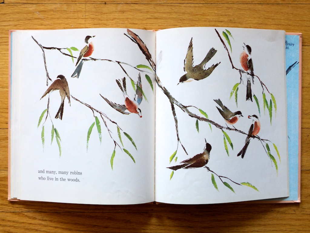 The story is a simple one, with half a phrase or even just a few words sprinkled on each page. It opens with a rabbit, discusses all the other animals that abound in the woods, builds up to the plentiful amount of robins that grace the woods, and ends on the fact that there are always more rabbits than robins as rabbits have so so many family members!