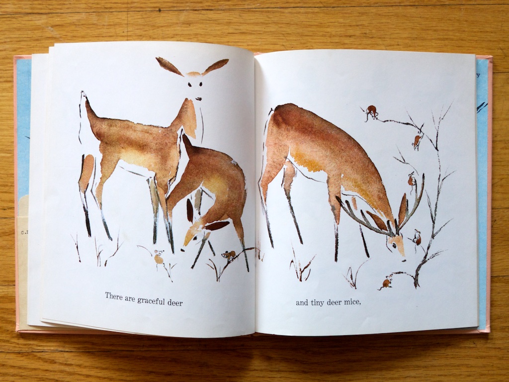 Published in 1960, the book has the cost-effective black and white pages every other spread. It is a strange feature as it greatly diminishes the impact of those particular, colorless spreads; but it also makes you gasp for breath on each color-filled page turn. Hawkinson’s brushstrokes, minimal details, and color-layering are definitely the things that continually draw me back to this book.