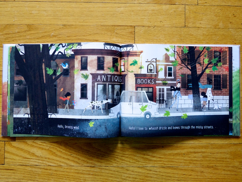The text of the book is a dialogue between a little girl and nature. (I must be completely honest here and share that I totally thought this was a a little boy when I first read it. My girls thought it was a girl, and in fact, the colophon and book jacket flap note that it is a girl. I misread the hair for just a longer boy cut and some hipster clothing and was perfectly fine with my interpretation. It really doesn’t matter for the story. And I mention that because I actually like that it doesn’t matter. I love the character with brown skin, stylish clothes, and a friendly spirit. I love the converse shoes and the smart outfit topped off by a billowy red scarf. I love that it doesn’t scream gender stereotypes, but feels just right for celebrating the season. This is a book for everyone, and I love it. Because the author and book info clarified the gender for me, I will use the correct pronouns in the rest of the review.)