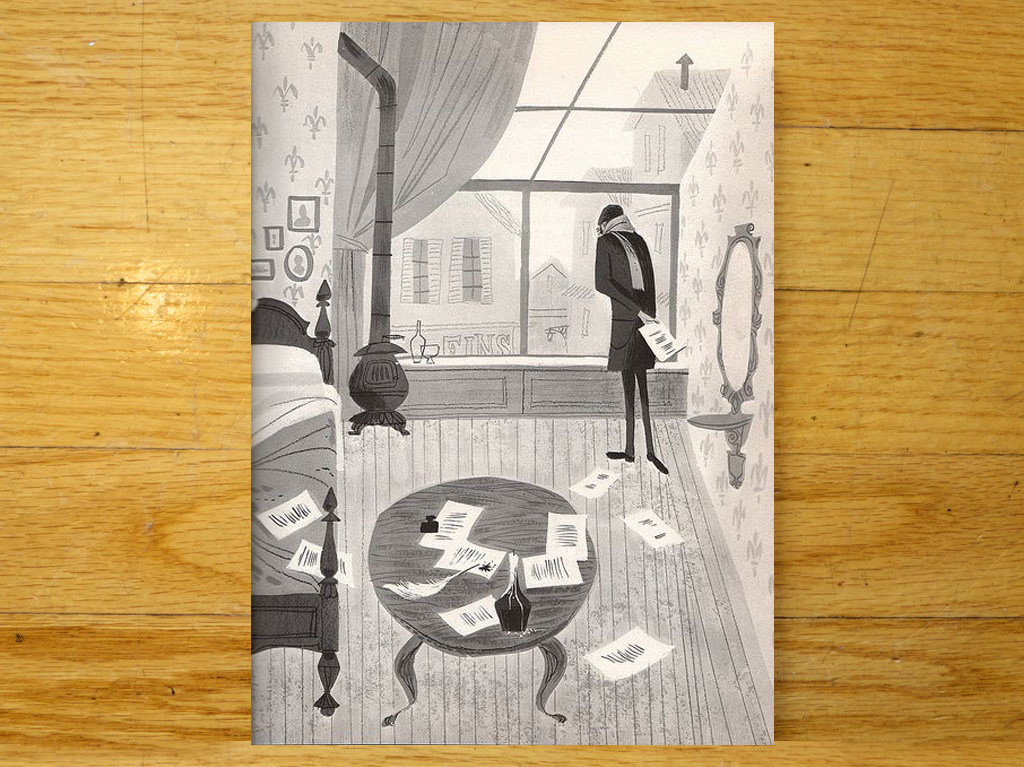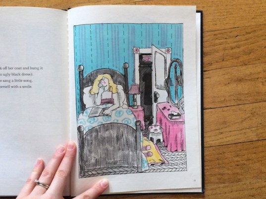 This is one of those illustrations that catches my breath every time I see it, which is made all the more striking by the fact that it is black and white. Plasencia’s use of flattened perspective is absolutely spectacular. The lines, the patterns, the layout… it is all just superb. Some of my favorite details are the bed frame shape, the view out the fantastic window, and the collage of frames on the wall above the bed.