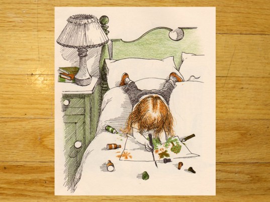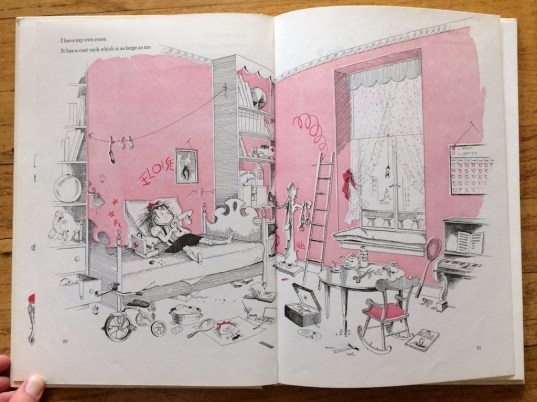 What little girl doesn’t just delight in this room? To be honest, living in our tiny NYC apartment — I’m drooling over the sheer size of this room! And those built-ins? And the view peeking through the window? Hilary Knight is truly a fantastic illustrator. I love the minimal color in the room, an obvious fit for the book, but also incredibly brilliant design to keep such a busy room still looking inviting. There are so many details in this one illustration that give you info about the heroine herself — the pink scribbles on the wall, the lack of organization, the ONE chair at the tea table, the ladder propped against the wall…. Such thoughtful placement and insight to add depth to the character.