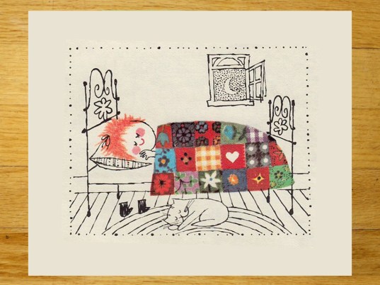 And one last bed scene that I keep coming back to. I love ink illustrations and I especially adore this one. The background is perfection in ink alone, and then layered on top is the colorful child and that brilliant quilt. And yes, note the oval, ringed rug. You thought I was kidding, didn’t you? I love all the details here from the ironwork on the bed, the decorative open window, the boots, the sweet cat, and even the detail of the pillow inside the pillowcase! So well done.