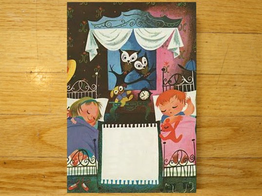 Seems only appropriate to follow a Morstad illustration with a Mary Blair. The two brilliant illustrators could not be pictured more differently than these two bedrooms. Blair’s sibling bedroom is packed full with color, shapes, and cuteness. From the wallpaper to the bed frames, Blair’s eye for detail shines through. It is hard to pinpoint the brilliance in this adorable illustration, there is just so much to look at and smile. Some of my favorite details though are the shoes under the beds, the hats hanging on the knobs of each bed, and the too small blankets that show the sleeping children’s feet! I am also a huge admirer of Blair’s use of pink. She knew how to capture and not fear colorful illustrations.