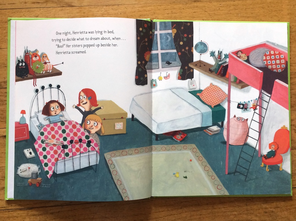 This book is hilarious and adorable, and the bedroom itself speaks to the clever humor and illustration style of Delphine Durand. That loft bed alone has my older daughter drooling with envy and my mama heart beating fast about that tiny metal ladder. Ha! I love the cohesiveness to the room, but the distinct styles of the sleeping arrangements. Henrietta is the left-out one of the three siblings and even the placement of her bed speaks to that fact. The book’s gutter almost acts as that invisible line dividing the two older girls’ space with Henrietta’s. The carpet is bold and dark, with a neutral rug on top (not oval or ringed, which feels much more modern.) I love all the dolls, animals, and monsters sprinkled around – adding character and filling the spaces with warmth. And Delphine’s pattern use is excellent. Not too much, and not too similar patterns; but just enough to keep you interested in the space.
