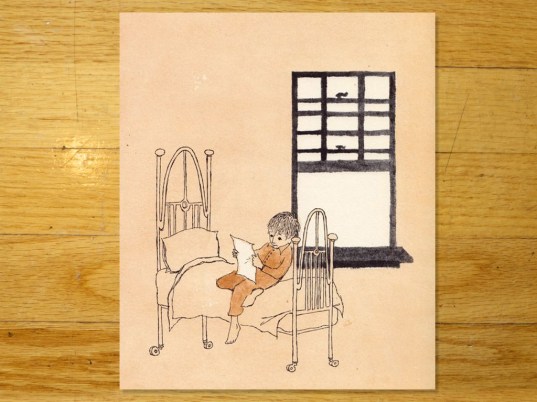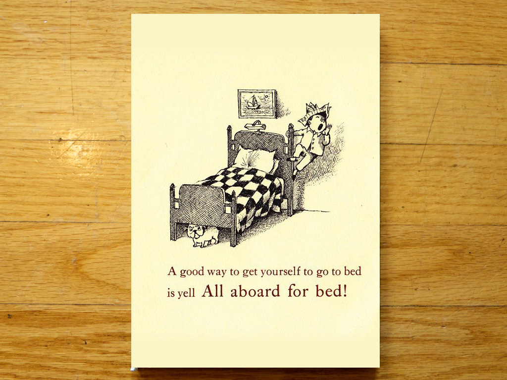 Sendak has a lot of memorable bedrooms — from Where the Wild Things Are iconic bedroom turned jungle scene; to Kenny’s Window mentioned earlier; Bears, Bears, Bears comes to mind too; and even in this short vignette from a brilliant Ruth Krauss book. I’m drawn to the style of this bed, but I particularly love the way it is used for the child’s imagination. Substitute a treehouse or playhouse for the bed, and the boy’s stance and dog’s lookout point still work excellently. A bed is not just for sleeping in Sendak’s and Krauss’ minds.