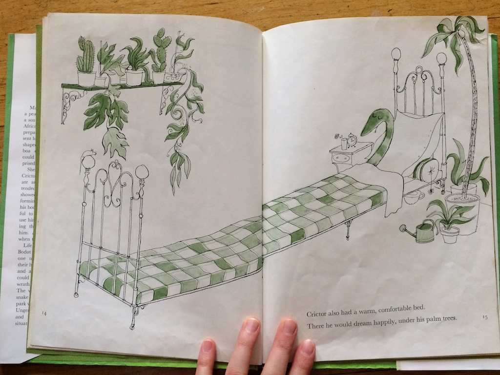 I love this book so much. Not only is it by Tomi Ungerer, hilarious, and clever; but it has two colors: black and green. Who could want for more? Crictor’s bed is delightful with his extra-long, comfortable bed and his decor of greenery. The layout of the page is excellent and I adore the thoughtful placement of all those plants, the tiny side table and its elements, the tube pillow with the spider coming out, and even the odd teacup underneath his bed which I’ve never quite understood. Ungerer never ceases to delight me with his linework, details, and humor.