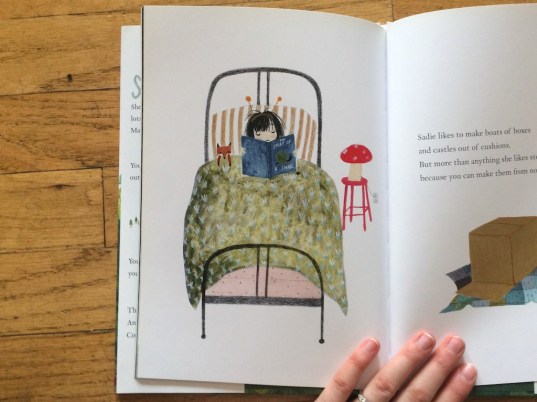 Oh, how we love Sadie. And her room, though sparse with details, immediately came to mind. I was actually surprised when I opened the book to it because in my head, there was much more. But no, Sadie’s room is minimal: just a bed, her supplies, and her imagination. Her stuff is jammed under her bed and into a corner, leaving lots of room for imagining and playing and disappearing into her ideas. Julie Morstad will always be a favorite illustrator for me and she gives lots of fodder for imagination to her characters and her readers. Patterns are key to Julie’s work and somehow she always makes them work together in tone and color palette. I love that Sadie’s fox is barely seen in her bed. And she has books and tools and supplies overflowing beneath her bed.