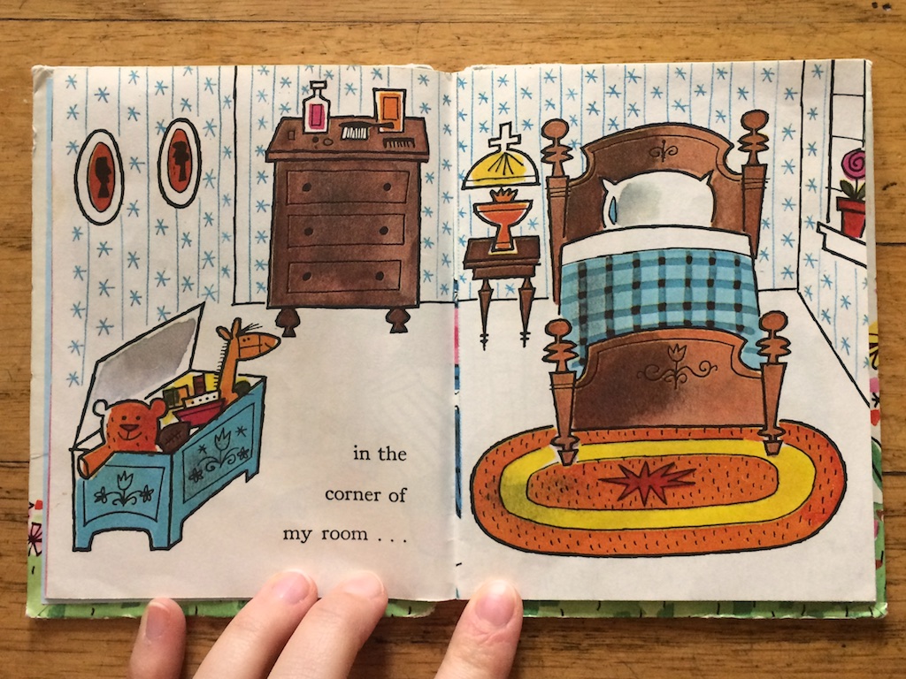 A favorite book from childhood, this bedroom—though not very visible in whole—is a great backdrop to Imogene’s distressing story. It is a full background, but quite flat in dimension and even in color, so nothing is too distracting. Imogene’s face and shock are front and center. Her bedroom is one of those that is there for the sole purpose of coming back to it on rereads. As I child, I would study her toys and that dollhouse (oh! that dollhouse), delighting in imagining playing with those things.