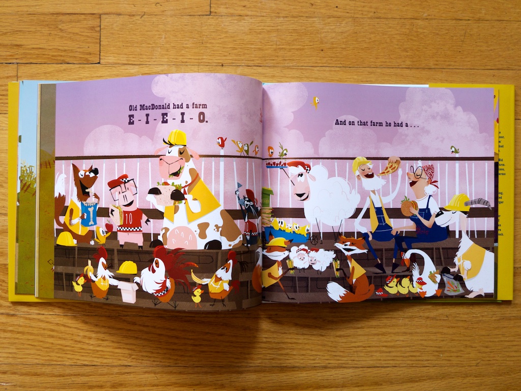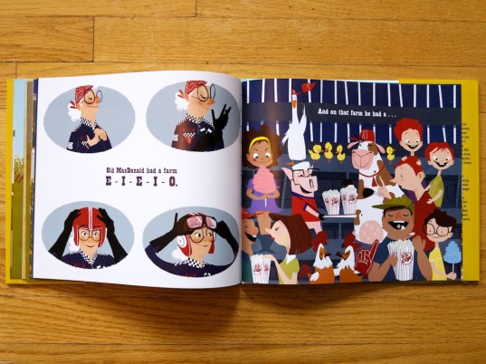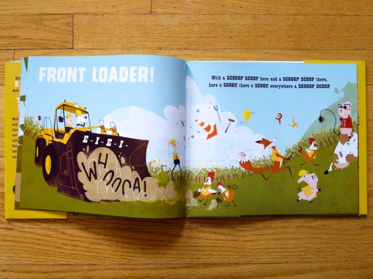 This book is so fantastically brilliant. My girls adore it and I love to read it. The build-up is excellent and the multiple plot-lines all building off of and into each other are a perfect mix. The art is bright and humorous, a great fit to carry and add to the story. Since the text stays true to the structure of the song, it is immensely important that the illustrations fill in all the details. Readers have to not only listen, but pay attention. It is outrageously fun. I also adore the addition of the wife and that she is a mechanic. This book could wrongfully be pegged as a “boys’ book” simply because it deals with construction and trucks (a stupid marketing argument and soap box discussion for another day). Nothing about this book is gender stereotyped in any way and that adds to its perfection. Everybody loves watching things be built. Anyone can be a mechanic. And who doesn’t love animals helping their beloved farmers and being downright hysterical in their hard hats, jackhammering, and wearing foam fingers!