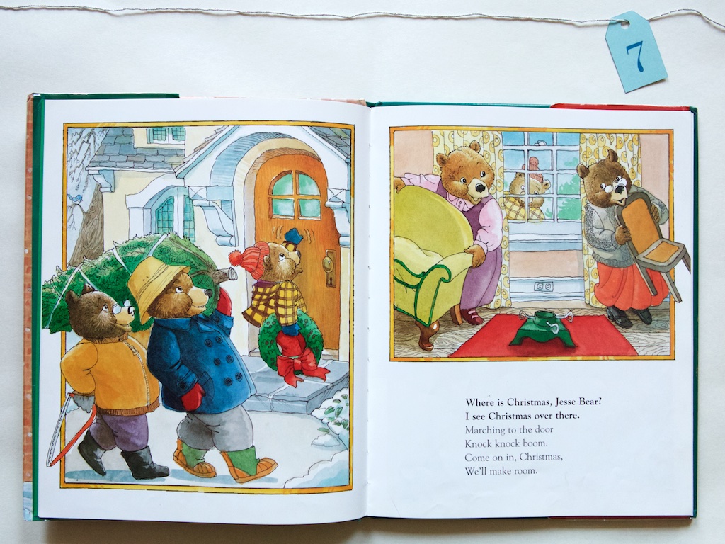 Day 7 of the Christmas Picture Book Countdown! This summer I discovered the delightful series about Jesse Bear that begin in 1986 and ran through 2004. My three year old fell hard for that lovable bear and I swoon over the childhood favorite illustrator, Bruce Degen, and his fantastic backdrops and enchanted world around Jesse Bear. I’m slowly tracking down vintage copies of the series, and our most recent acquisition is this special Christmas story! I’m sure I’ll be talking more about this lovable bear in the near future, but let me start by sharing Where Is Christmas, Jesse Bear? by Nancy White Carlstrom, illustrated by Bruce Degen, 2000.