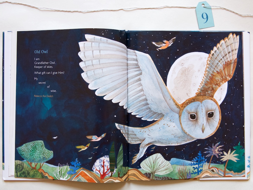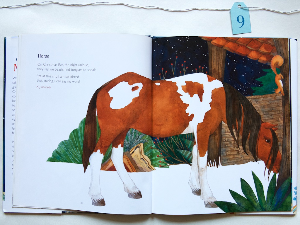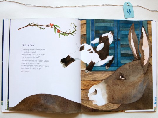 Day 9 brings us a book of selected poems. This book is so incredibly lovely, I was quite surprised to realize I haven’t featured it before. It is a book about Christmas Eve. About a moment when, if all creatures were given human thought and speech, they might utter responses to welcome and comfort the baby Jesus in the manger. Allow yourself to wonder with Manger, poems selected by Lee Bennett Hopkins, illustrated by Helen Cann, 2014.