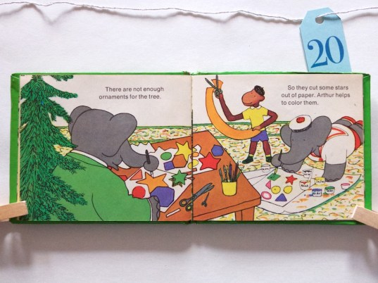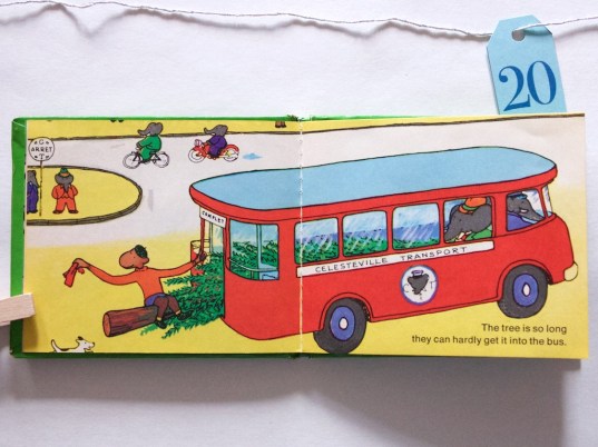 Day 20 brings an old, tiny book from the Babar series. I really love tiny books. While I appreciate picture books in all their forms, I really think there is something special about tiny books. They match their audience perfectly – little hands, little books. I think Beatrix Potter really knew what she was doing with her classic, small books. I have a slowly building collection of tiny books, and while I would love to keep them pristine and precious; I really love to share them with my girls. They adore them. They carry them around, read them to their stuffed toys and dolls, collect them in bags… tiny books are so delightful.