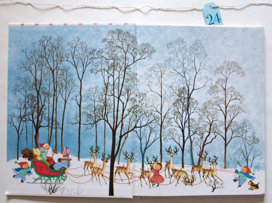 From his “…dash away all” to his “to all a good night” this Santa is quite adorable, adding a more whimsical edge to an old poem. This edition of Moore’s words is an excellent way to prepare for the final day in our countdown and Christmas Eve, helping put those visions of sugar-plums into reader’s heads. Merry Christmas Eve!