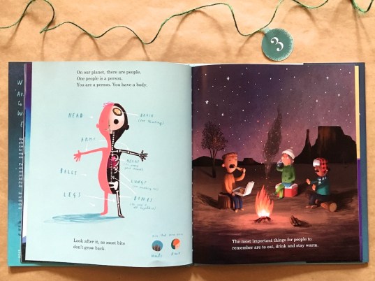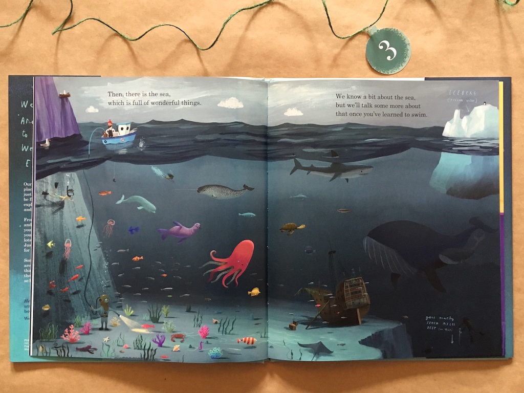 It opens with a “Well, hello.” from way out in outer space. Jeffers explains a bit about the solar system and the earth. Short and simple (kind of) answers about very big concepts. Land, sea, sky… and then people, starting with the person the book is for.