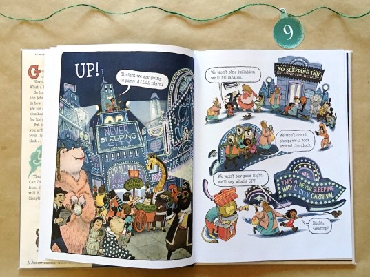 This book is all kinds of fun. The storyline is totally relatable for most kids, never wanting to go to sleep, and such a fun idea of escaping to another city.  And the concept of the contagious yawn is giggle-inducing, not to mention my four year old cannot read this book without yawning with every character! It is hysterical.