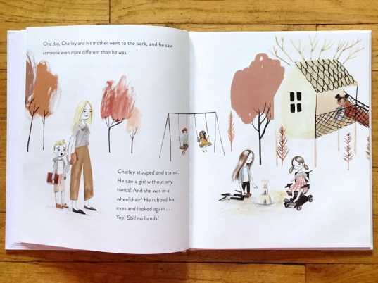Then one day, Charley enters the park with his mom and encounters someone even more different than himself: a girl with no hands! And she is in a power wheelchair. He doesn’t know what to do. He is curious about what happened to her hands. And it makes him feel odd in his stomach. Before he can stop himself, he loudly blurts out an incredibly rude question to his mom.