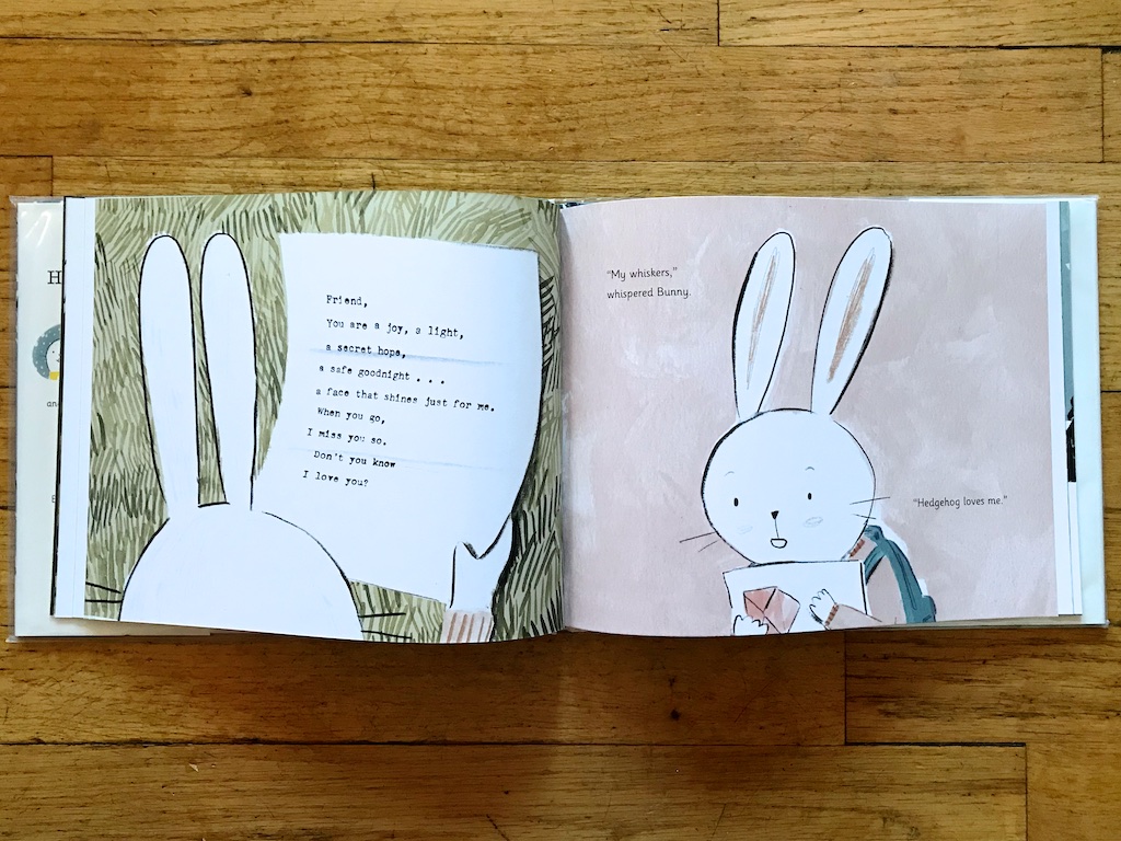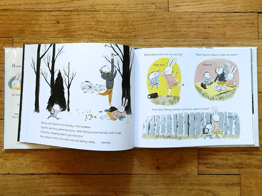The story begins with a moody Hedgehog discovering a letter. In fact, it was a love letter, and Hedgehog knew it was meant for him. And it made him feel different than usual. When he met up with his two friends, he was happy, cheerful, enthusiastic. His behavior surprised them so much, his friend Bunny gave him a big bunny squeeze goodbye.