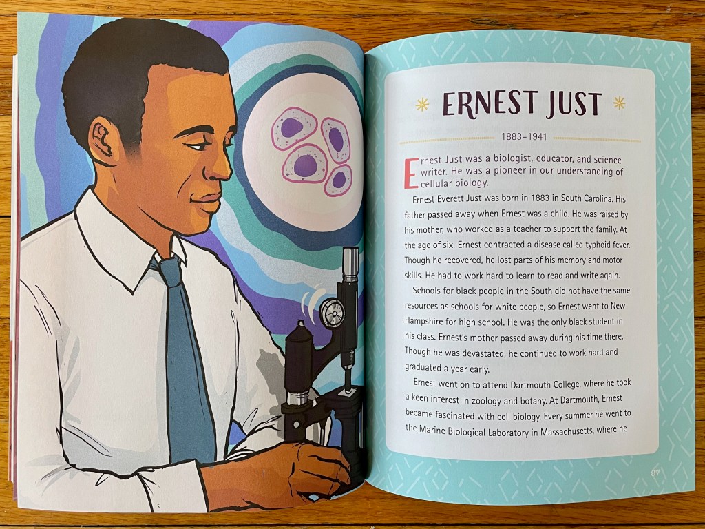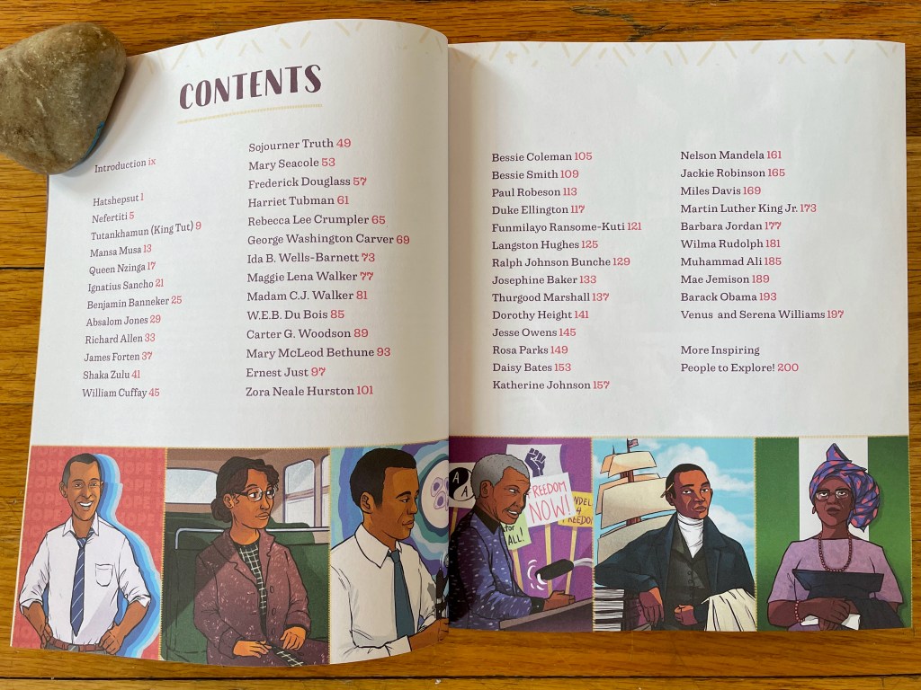 Pictured above is the table of contents for all 51 figures highlighted. Some are familiar, but many are surprising and new, at least to me! The range of time periods, locations, gender, fields, and interests is phenomenal. There is an inspiring hero for everyone here! And this is not an exhaustive list by any means. There is also a spread in the back with more names to explore and a brief description of them as well.