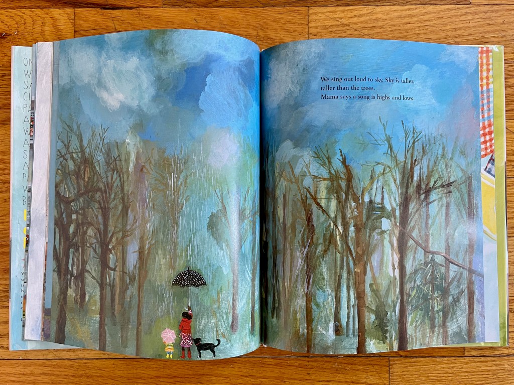 And nothing big happens as they do their day and sing to the sky and then come home to go to bed early as growing children must. But in the eyes of this sweet little narrator, nothing big needs to happen for everything to be just right in their home, their patterns, their joy of just being “me & Mama.”