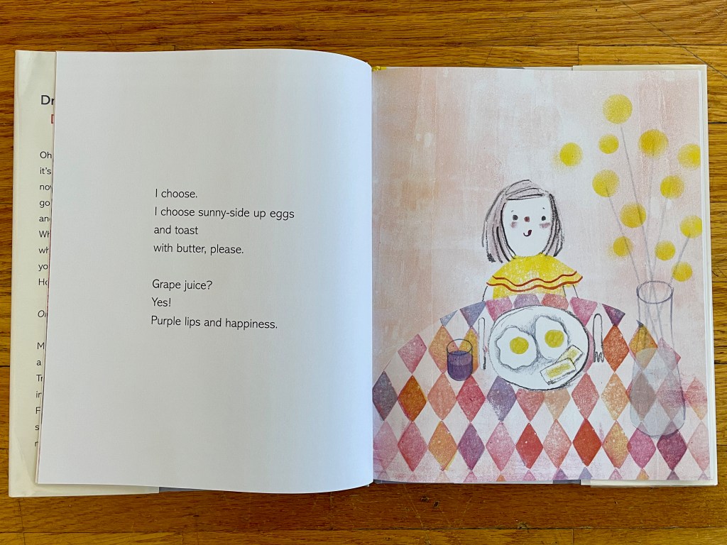 The illustrations begin the story from the first page turns of the copyright, title and dedication pages; but the text begins with the words “I choose.” The best way to start a day, and perhaps one could argue, a book too. Everyone likes to have their choice in life, and this young girl is starting her day off in the happiest way. She then turns to greet the day outside only to realize it is a gloomy, rainy kind of day and she must stay in… all day.