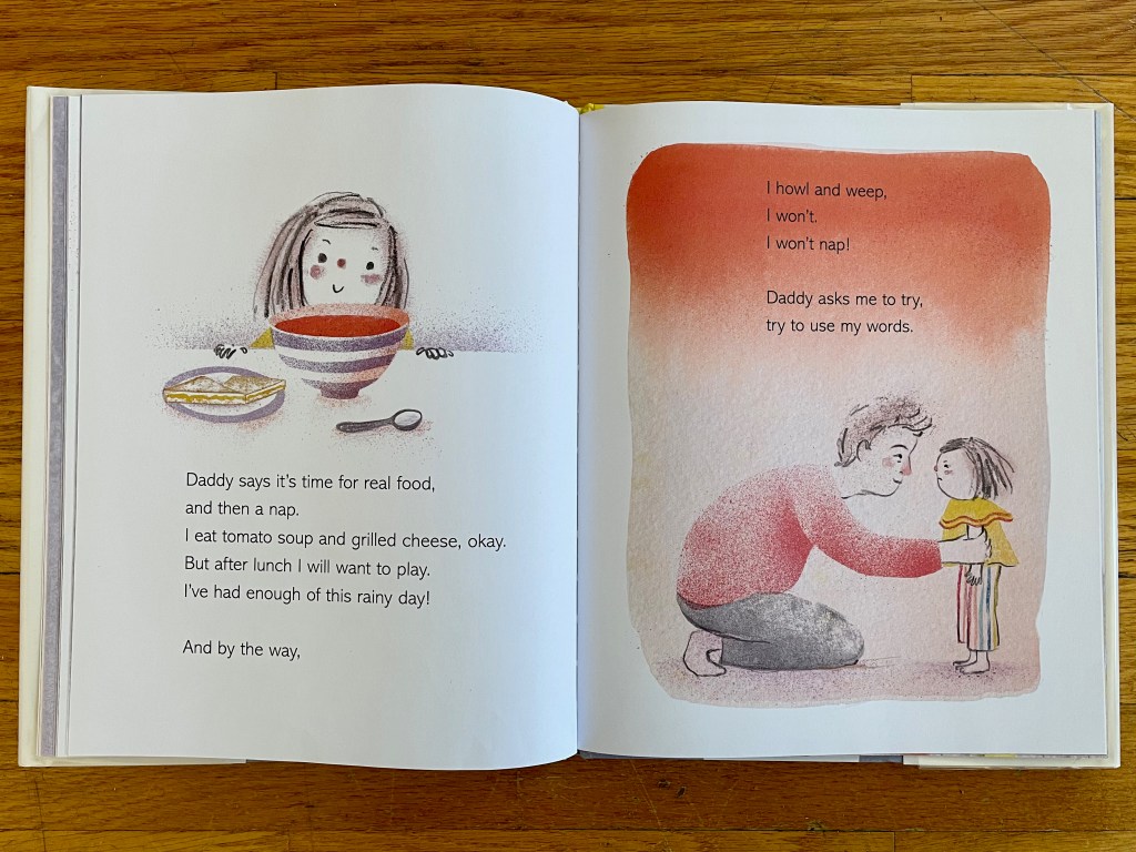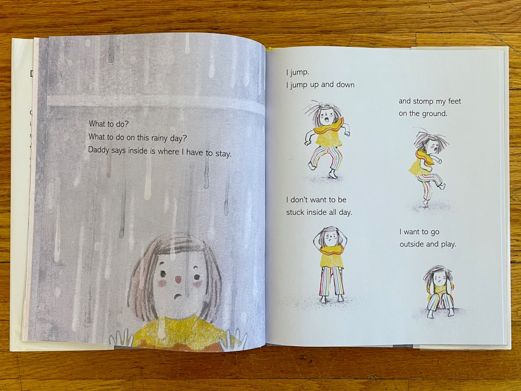When lunch and a nap interrupt her new creative plans, her emotions bubble to the surface again. Her dad once again talks her through it and encourages her to voice her frustrations as well instead of acting on them. She chooses again to make the best of it and the rest of the afternoon goes cheerfully while she has quieter indoor activities, waits for her mother to come home and the rain to clear, and finally gets to end the day with favorite activities, the best choices and memories of a day where she found a cheery day in surprising places.