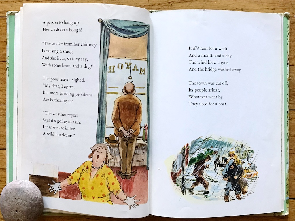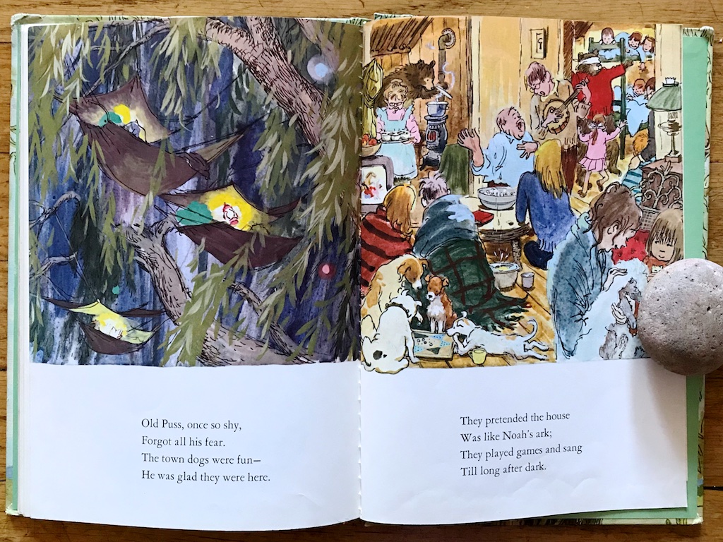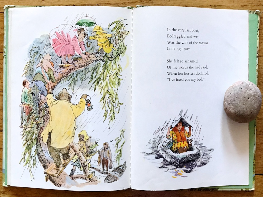 Miss Twiggley and Puss saw the weather coming and they prepared their home. But they did more than hunker down alone. They checked their supplies and built extra platforms and strung hammocks and made lots of warm soup. When the wet mayor and many townsfolk float close by, they are ready with open arms to give them shelter. Even when the ashamed and embarrassed mayor’s wife is in the last boat to arrive, Miss Twiggley lovingly takes her in, gives her her own bed, and even a hat to sleep in!