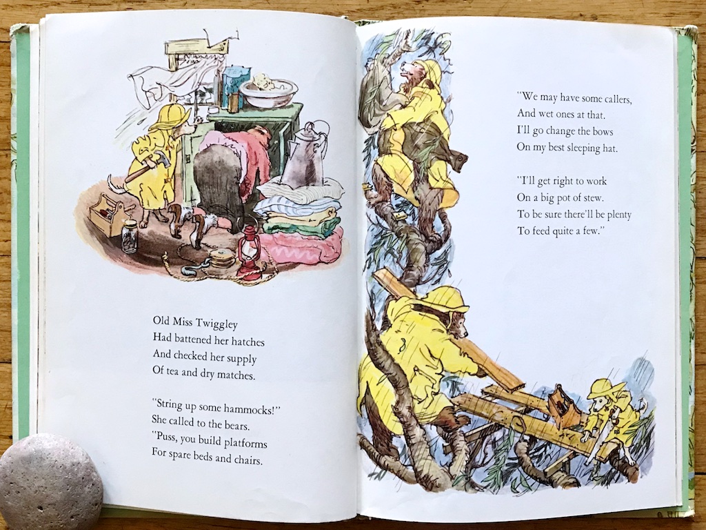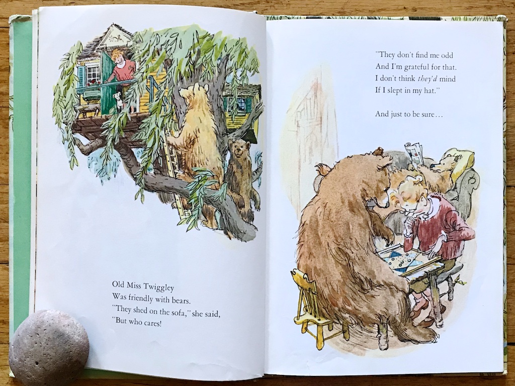They live quite well and care for each other and even are friendly to bears who come for visits of tea and games. The bears enjoy Miss Twiggley’s company, even though she sometimes sleeps in her hat because she can and they get tired of having to be so neat with her.