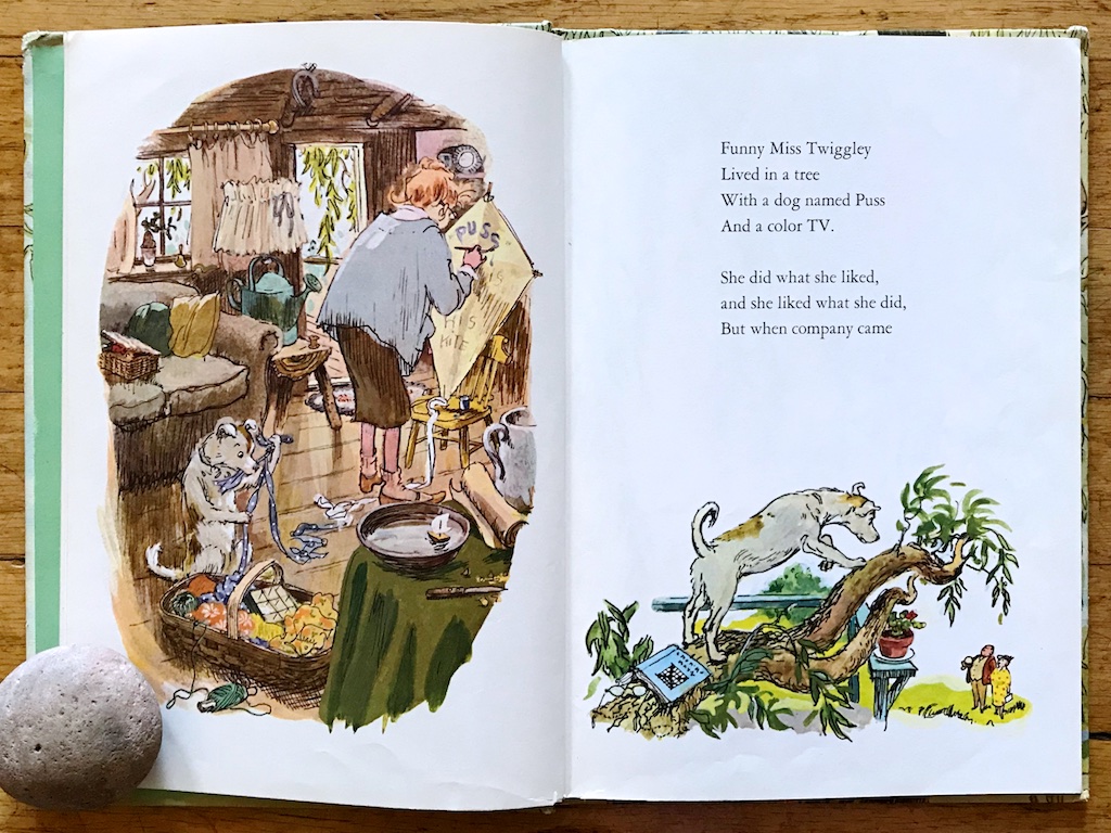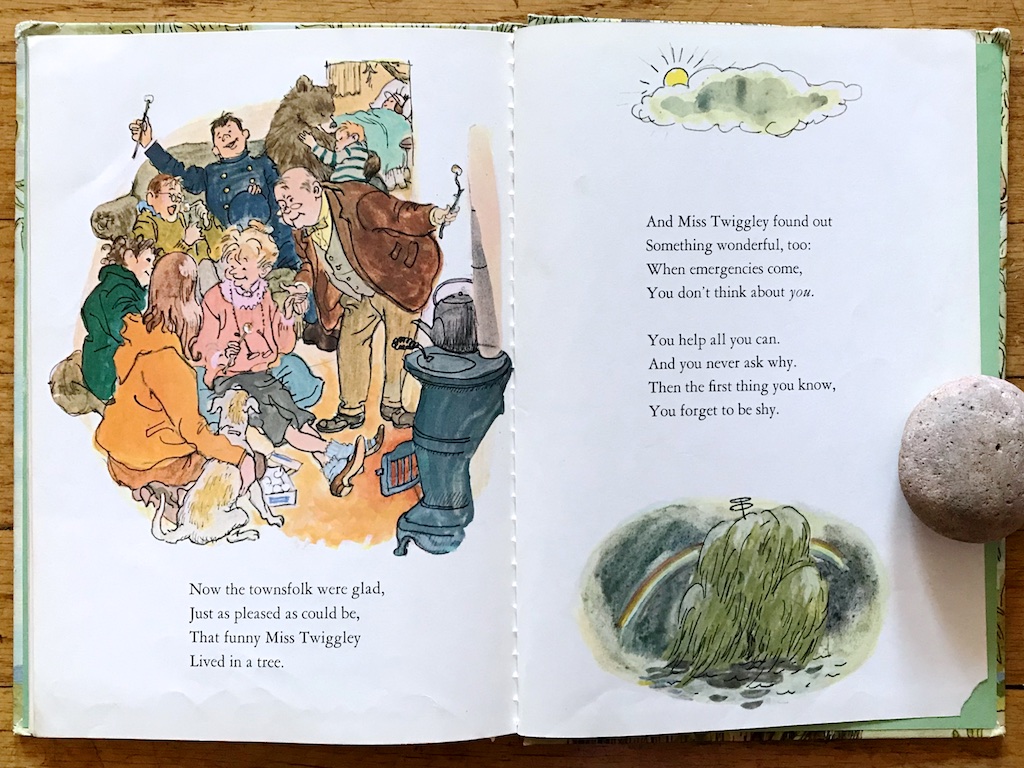 This is a long picture book that I can read again and again. It has a point and a moral of sorts without being saccharine. It is memorable and delightful, very vintage – obviously lacking in diversity of any kind – but lovely and thoughtful too. This is a gem, as is Miss Twiggley and her special tree.