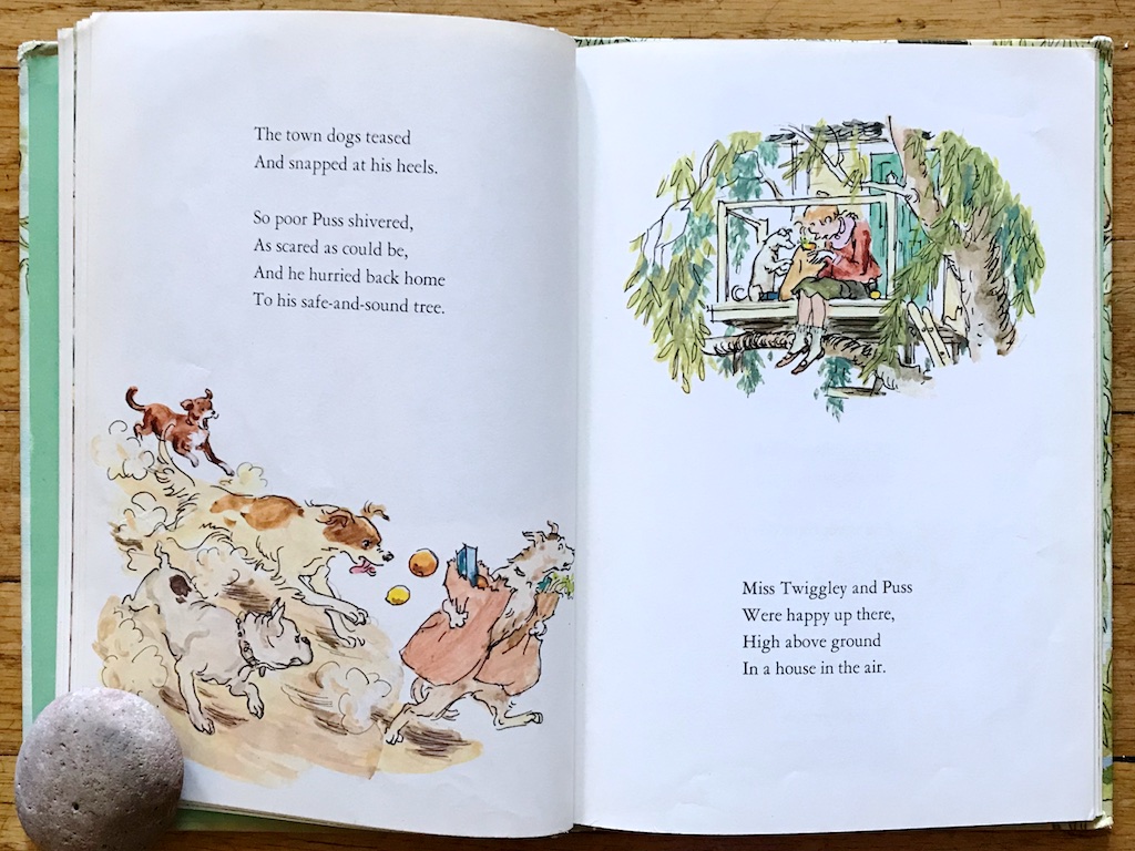 But even poor Puss has issues with the town dogs not understanding him. When he runs the household errands and picks up groceries, he is often chased and teased by those mean dogs. But he is always glad to be back at home with Miss Twiggley, high above the ground.