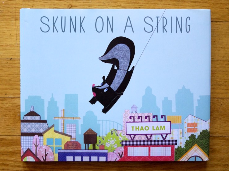 It is late on another Wednesday and I have been holding this wordless book interview for far too long as well. I fell in love with this book the first time I saw the trailer and I was delighted to receive a copy from Owlkids Books. A humorous story about a skunk in a terrible predicament traveling over a colorful and lively city – this book is a delightful way to usher out August and welcome in the next month. I hope you enjoy Skunk On A String by Thao Lam, 2016. And especially Thao’s lovely interview. I so enjoyed reading her answers!